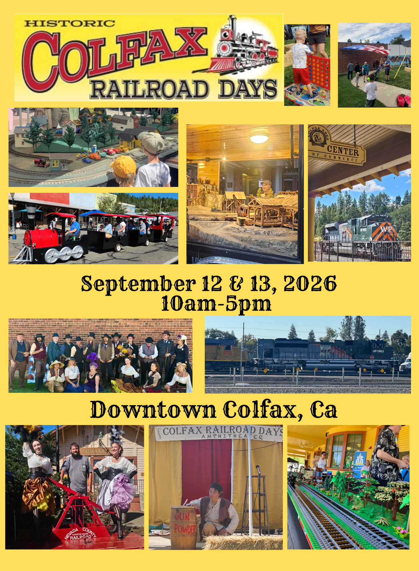 Colfax Railroad Days is a celebration of Colfax's role in the construction of the Transcontinental Railroad. It was the terminus for supplies, equipment and laborers for their push to build the railroad bed through the Sierra and beyond.
